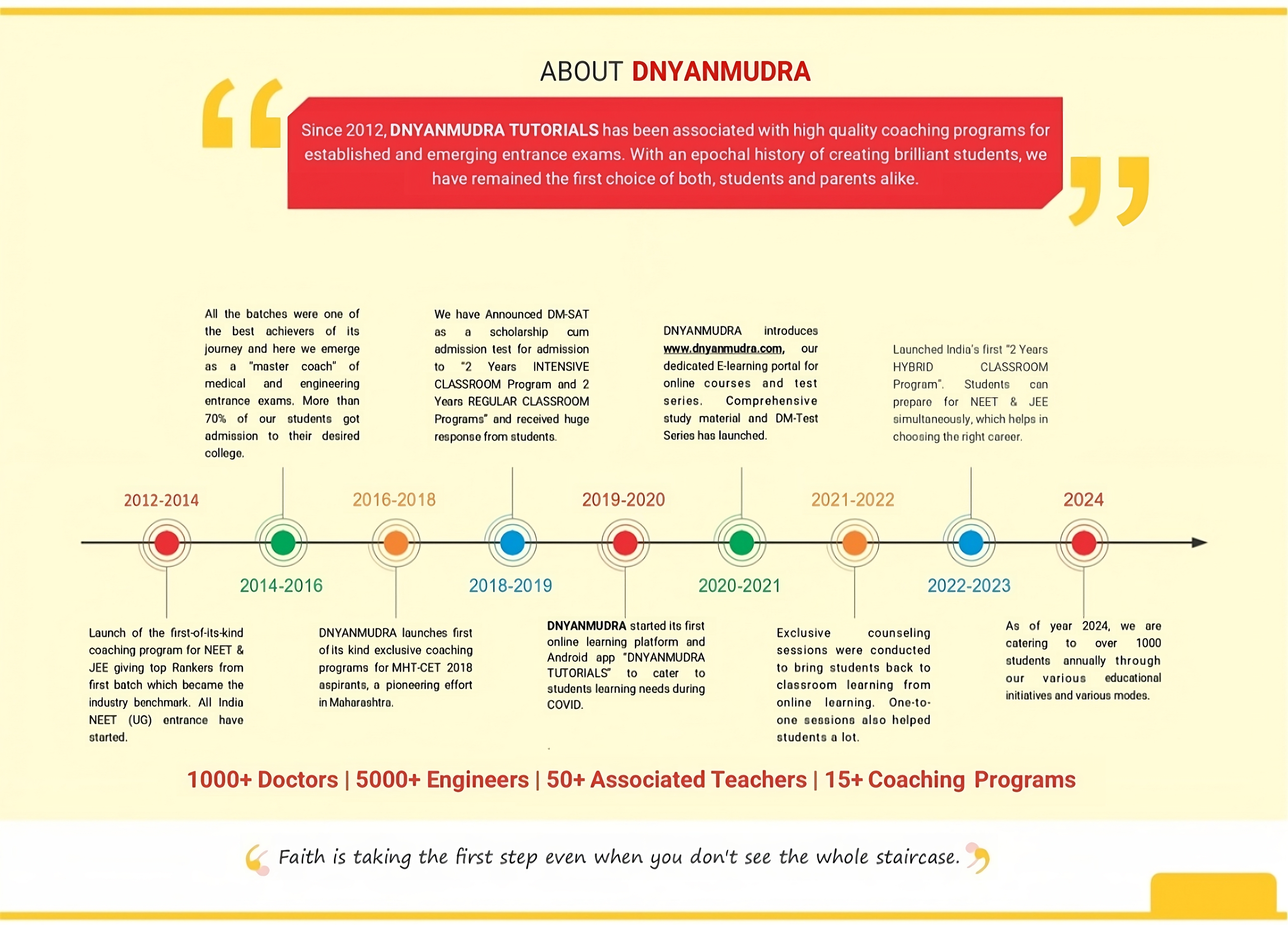 Our journey from 2012 to 2024 has been marked by growth, innovation, and a steadfast commitment to student success. We look forward to continuing this journey with the same passion and dedication, striving to make a positive impact on the lives of our students and contributing to their achievements in NEET, JEE, and MHT-CET.